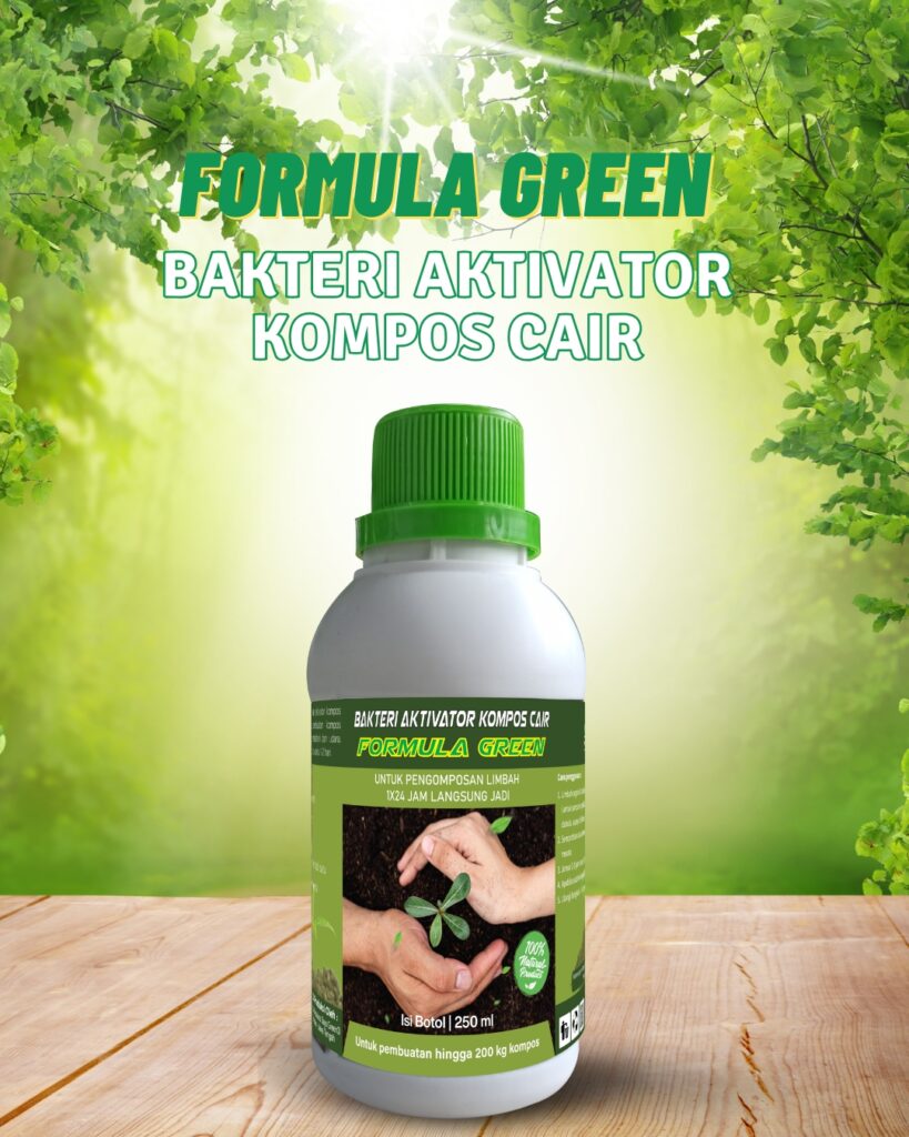 Formula Green merupakan bakteri aktivator kompos dengan konsep aerob yaitu pembuatan kompos terbuka dengan bantuan sinar matahari dan udara. Proses pengomposan hanya butuh waktu 1-2 hari.